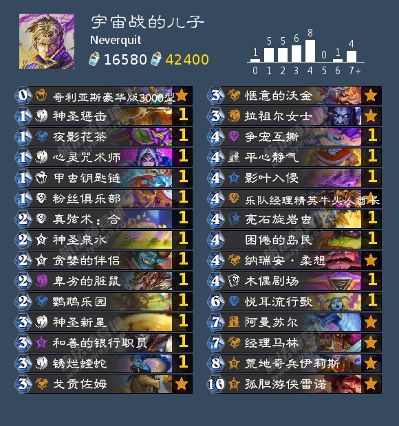 标准环境的牧师目前的问题就是解牌不够强力,导致今年关于牧师一切的纯控制型卡组几乎销声匿迹,因此这套卡组仅推荐为了针对宇宙卡组去玩。利用地表和脏牌,实现比萨满沙德木刻+伊辛迪奥斯、神铜须+爆破工头等comb更快启动。