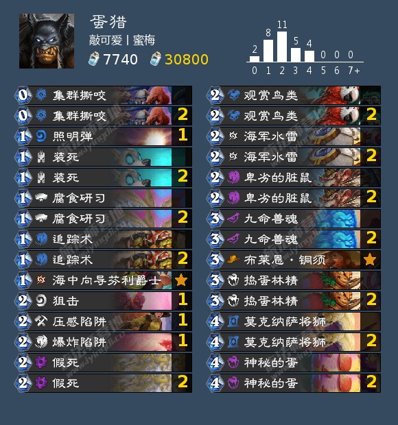 构筑选择上修改了市面上较多的40蛋猎构筑,精简随从和解牌改造成了30构筑。同时在对于otk的对局上保留了双脏鼠+3针对性奥秘(心火牧多爆炸陷阱可换成游荡怪物),由于随从减少检索牌也更容易摸到神秘的蛋和启动海雷套斩杀。缺点就是莫克纳萨将狮也相对来说更容易射手了,打快攻类也更需要捣蛋林精来保障一下血量。