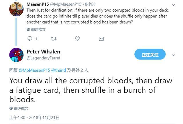 A:你会先抽两张堕落之血,再抽一张疲劳,然后再洗一堆堕落之血进牌库。