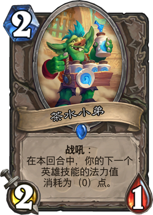 看它的模型,配合正常英雄技能的打1站21,效果等同于吹箭鱼人,人家还能过墙。和冠军包的击剑教头特效,英雄技能减2费,几乎一模一样,身材亏的差不多(3费同段位的铁炉堡火枪手同样完胜)。带这张卡,你甚至不如带小精灵,配合英雄技能一下,2费打1站11,可能还更灵活……