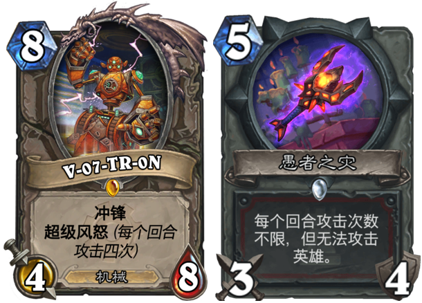 在这个榜单之中,出现了两张并列的卡牌,那就是合体后的V7-TR-0N机器人和战士的武器——愚者之灾。在一个回合内,这两张卡牌都能单卡攻击4次(愚者之灾的对面有足够数量和质量的随从),堪称炉石传说中的突破了攻击次数限制的两张卡牌。在单回合攻击次数上,他们并列第一!