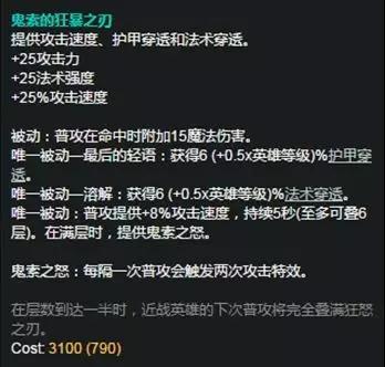+25攻速,普攻伤害变成附带15点魔法,提供总护甲和魔法穿透。