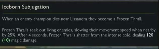 当敌方英雄在丽桑卓附近时死亡后,他们会变为冰霜奴仆。冰霜奴仆会搜寻活着的敌人,降低他们周围的移动速度。几秒后,冰霜奴仆会因为严寒而破碎,造成范围内的魔法伤害。