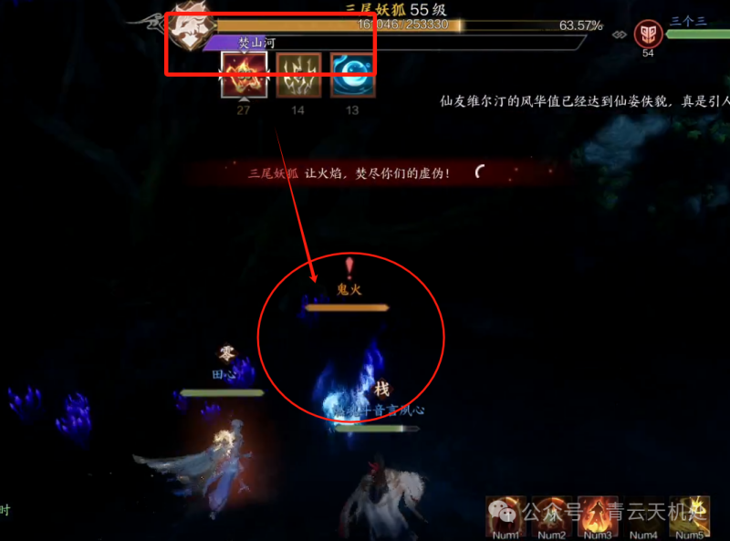 ②焚山河:boss跳到场地中央,场边出现鬼火,boss开始读条焚山河,读条结束造成巨大伤害。
