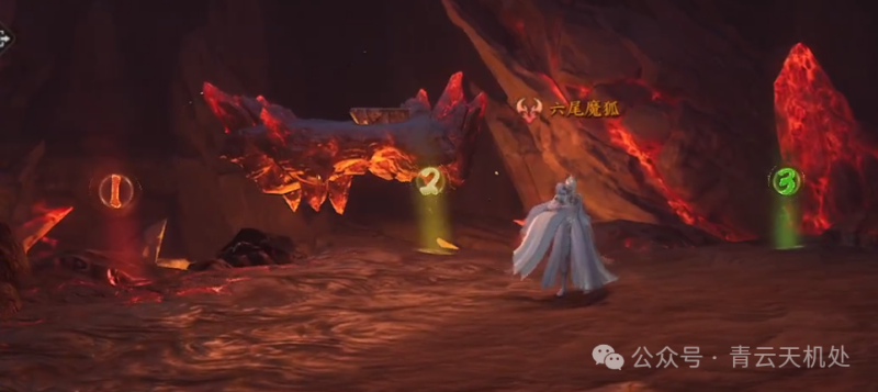 ②狐狱刑火:场地中出现大量红狐狸进行直线冲撞,boss闪现到场地边缘使用直线光波