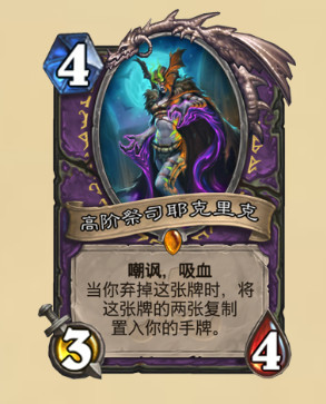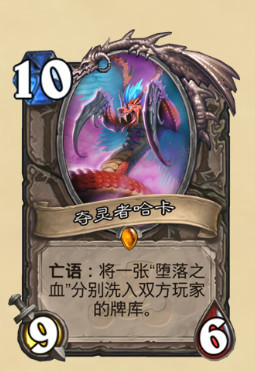 这是一张针对后期卡组的牌,堕落之血会越来越多,不断填充污染你的卡组,雪球越滚越大。针对那些无限循环卡组,另外还有一些后期OTK卡组也会受到影响,比如机械克苏恩,这一张卡,就让机械克苏恩头疼。