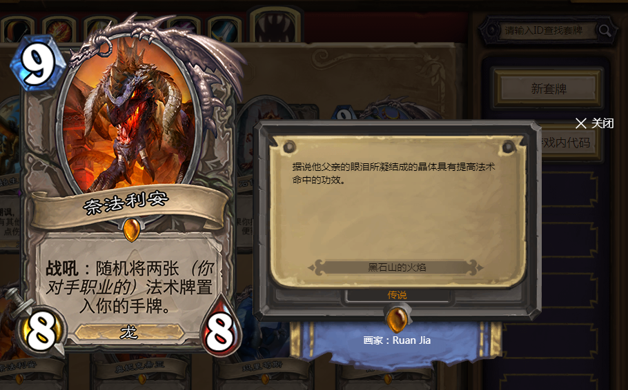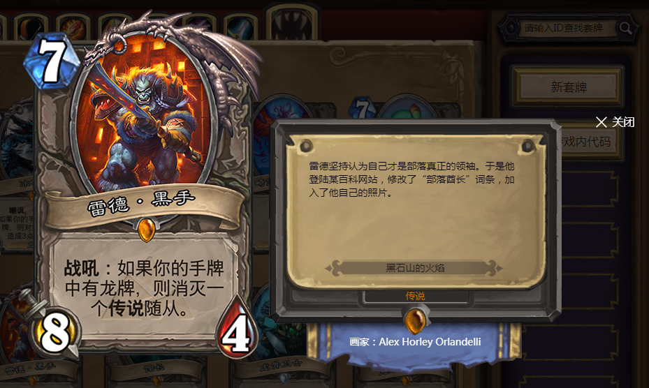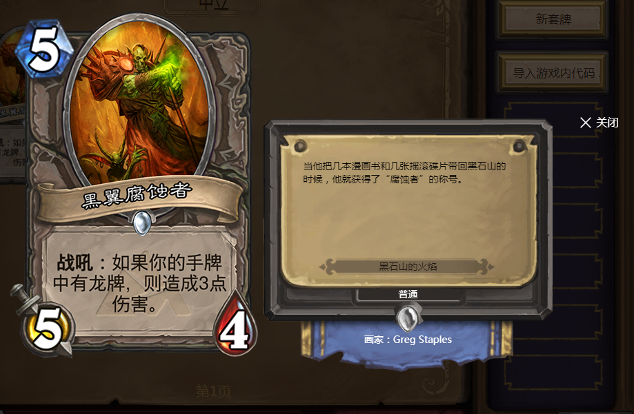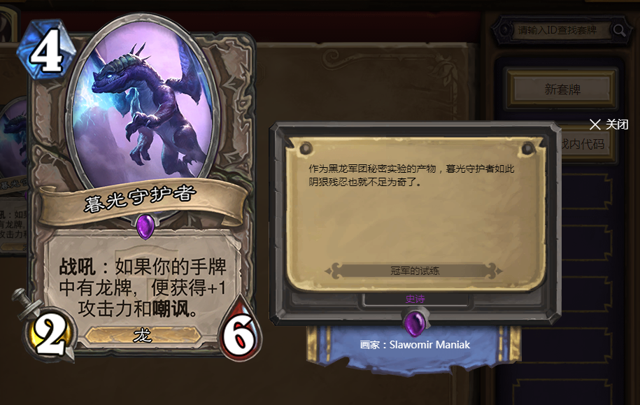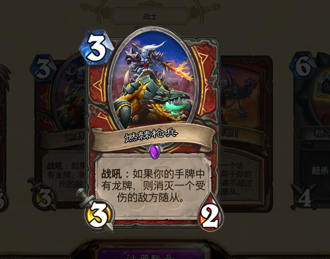 5费5/4,如果手中有龙牌还能多打3点伤害。性价比很高,在当时的黑石山版本中几乎是每个人都必带一张的卡牌。多打的3点伤害可以用来解场,即使裸下这张卡牌也不算亏。所以在当时的龙系玩法中,这张卡牌非常受欢迎。