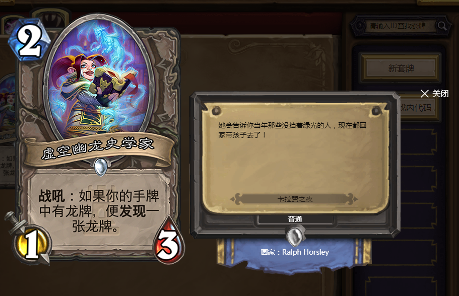 虽然身板不算特别好,但是他的特点在于,当你手中有龙牌时你能消灭掉对方的一个传说随从。考虑到当时的版本中大部分优质的随从都被列入到传说随从之中,所以带上一张似乎也没有太大的问题。