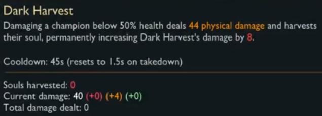 在经过11月21日的热修复补丁后,黑暗收割的伤害变成了40-80(随等级提升)(+0.25额外AD)(+0.15AP)(+灵魂数x5),刚上线的时候基础伤害是50,每个灵魂提高8点伤害,S9季前赛第一天的游戏,就是全民黑暗收割的情况。但即使进行削弱后,黑暗收割依然是一个中后期很强的符文。