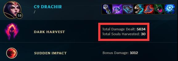 不过,也不是没有办法对付黑暗收割,如果你一直保持较为健康的血量,对线期间多找机会消耗对手,就能够压制带黑暗收割的英雄。毕竟,前期对线打消耗的话,黑暗收割触发不了特效在换血方面很亏。这也是为什么上单和ADC位置,基本上没有太多英雄带黑暗收割的原因,上单换血都是打一套就走,ADC不会主动上去交火,这两个位置都很难拼到半血以下。