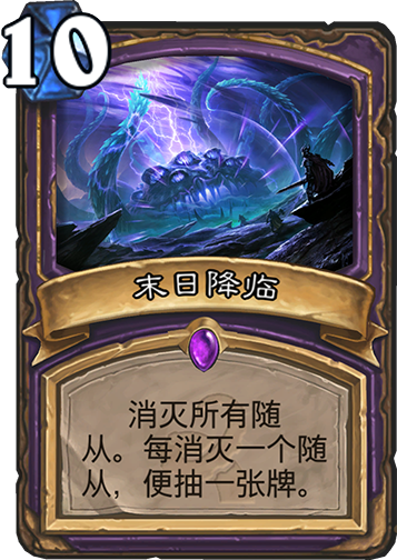 术士有着茫茫多的清场法术,从二费亵渎到八费扭曲虚空,以及这里将要提到的十费法术末日降临。末日降临的清场效果其实跟八费法术扭曲虚空一模一样,可以将场上所有的随从消灭掉,只是,末日降临还会根据消灭的随从数量抽牌,抽个五六张卡牌轻轻松松,用的好补充手牌恢复战斗力,用的不好爆掉自己的卡牌,提前进入疲劳,所以呢,对于可以用英雄技能抽牌又容易进入疲劳同时又不缺清场法术的术士来说,末日降临有可能真的不太适合。