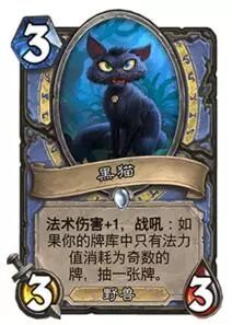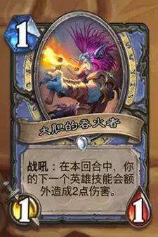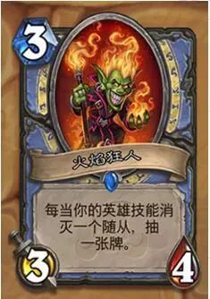 3费3/4裸下不亏的身材,光环效果是火冲杀死一个随从则可以抽一张,一般法师的话1点伤害的火冲杀死一个随从不简单,很依赖法术或者随从的配合;但是换成奇数法的2伤火冲就好很多了,更容易补刀点死生物;何况还有吞火者这个强化火冲的手段,只要火妖狂人活下来,4伤火冲杀随从还不是轻轻松松,过一张简直太容易,所以这张卡同样更适合奇数法。