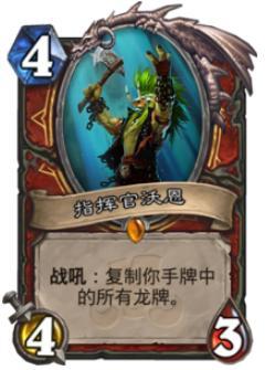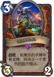 新发布的这张橙卡的效果是战吼:复制你手牌中的所有龙牌。从这张战士的职业橙我们也可以看出一些端倪,新版本的龙战也有可能成为新的天梯构筑,当然除了这张职业橙外,还有一张新发布的紫卡来支撑这一体系,燃棘枪兵,自带斩杀效果,就目前这两张牌来看,龙战体系极有可能成型,职业新版本的龙战是走控制体系还是中速体系那就要看接下来的新卡发布了。