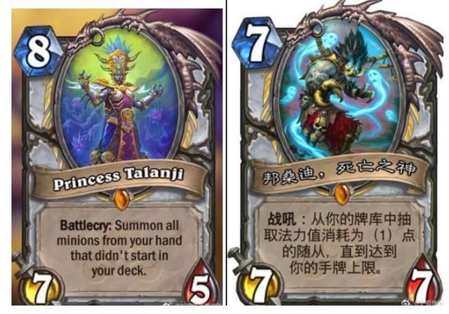 这两张橙卡的效果并不统一,前者的效果召唤你手牌中并不属于你初始牌库的随从牌。这张牌对于新版本来说,赃牧可能会成为新版本的牧师构筑之一,对于牧师而言这个版本的控制体系不强,主要的原因是因为低费牌中没有比较好用的AOE牌,一旦在这一方面有补充,新版本的牧师可能会很强,至于死亡之神来说,可能会有OTK体系的牧师。