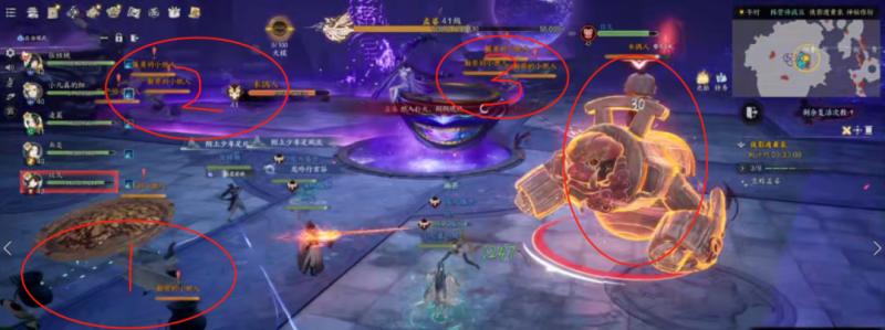 BOSS进入无敌状态 ,门口刷新木偶人,另外三个方向刷新小纸人。先不管木偶人,顺时针方向清掉所有的纸人。可以直接去一个DPS在3号点清。