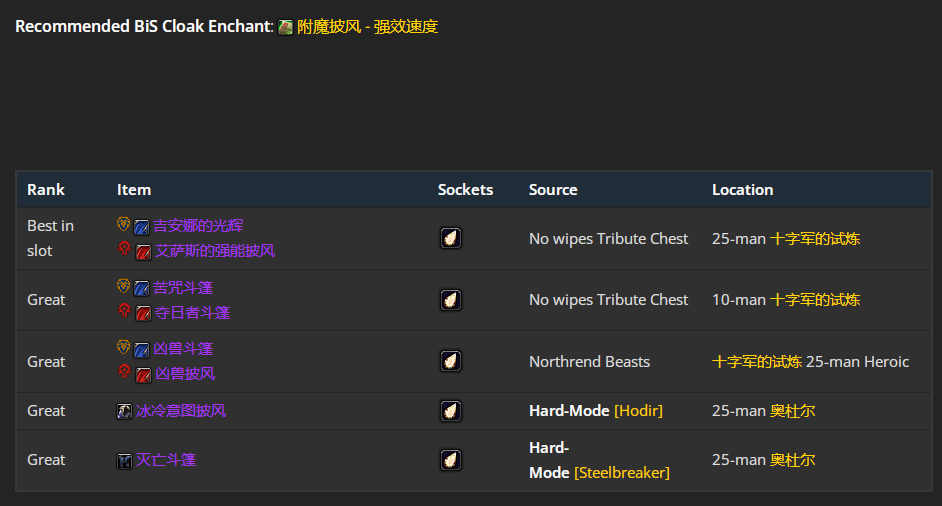 最优解是 吉安娜的光辉 艾萨斯的强能披风,附魔推荐附魔披风 - 强效速度