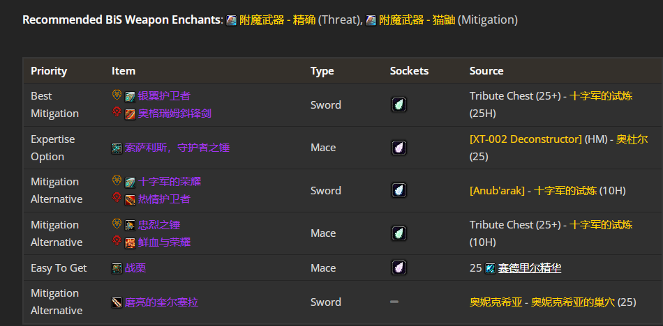最优解是银翼护卫者 奥格瑞姆斜锋剑,附魔推荐 附魔武器 - 精确 、附魔武器 - 猫鼬