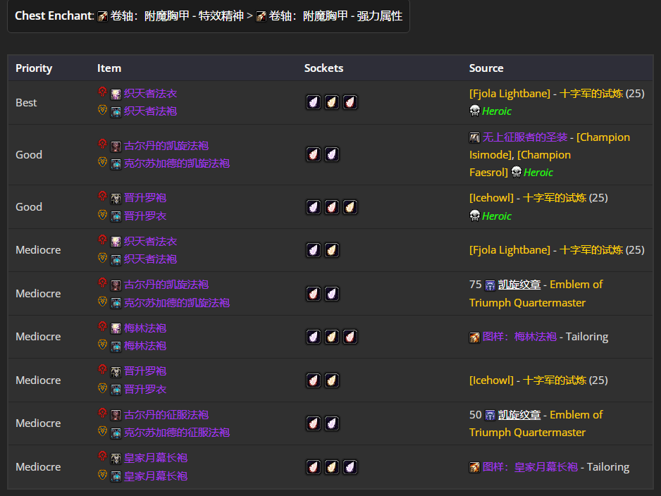 最优解是织天者法衣 织天者法袍,附魔推荐附魔胸甲 - 特效精神 、 强力属性