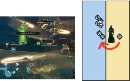 8、此外还会有两个区域AOE,通过观察脚下区域来躲避。当水/山半区地板有明显技能特征,会出现漩涡和地震注意躲避,如需要T位拉能量可以如图跑位: