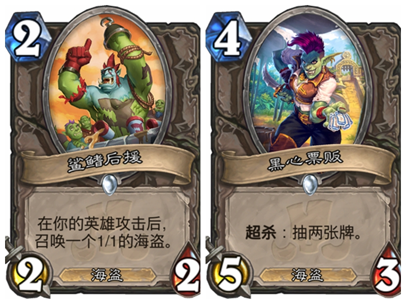 虽然海盗是男人的浪漫,但这张牌有点生不逢时,很多优秀的海盗都退环境了,例如曾进入构筑的两位中期老哥:南海畸变船长、娜迦海盗。新版公布,就中立黑心票贩和鲨鱼后援两个,并没有多劲爆,就看后续放出了。