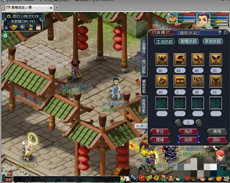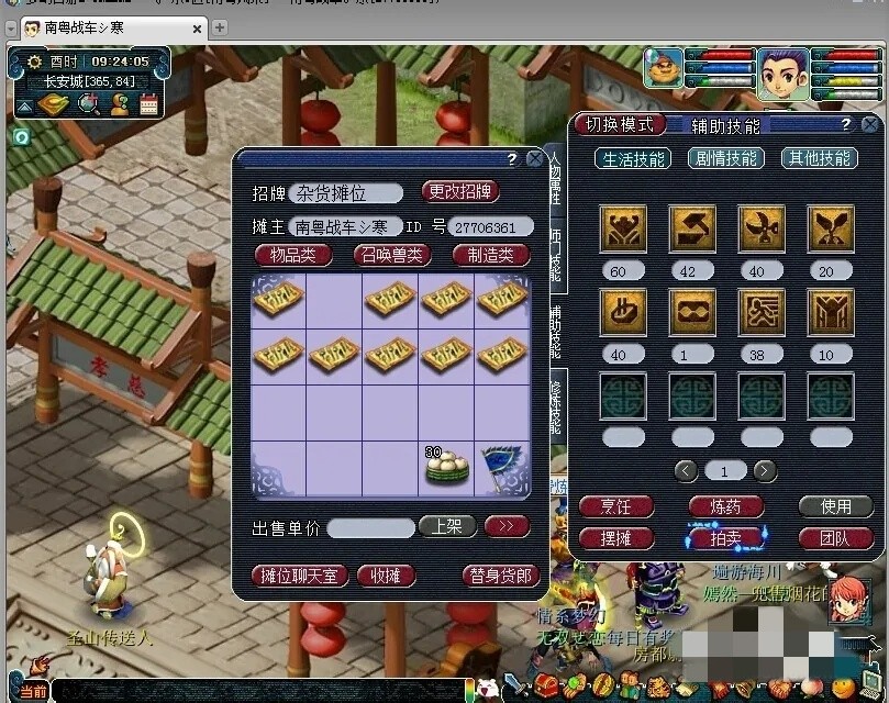 点击角色人物属性,找到铺助技能,右下角有摆摊,点击进入。