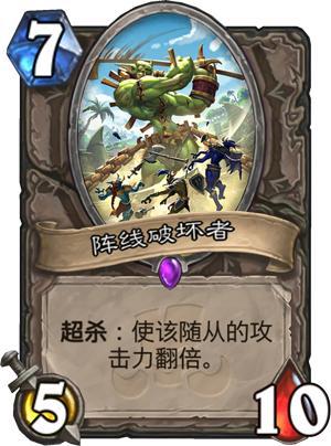 阵线破坏者。中立紫卡随从:7费5/10。超杀:使该随从的攻击力翻倍。普通的天梯环境白板没有太大的用处,解卡太多可以随便处理。JJC神卡又一张,你让759的沙虫情何以堪,又是野兽属性害了你。
