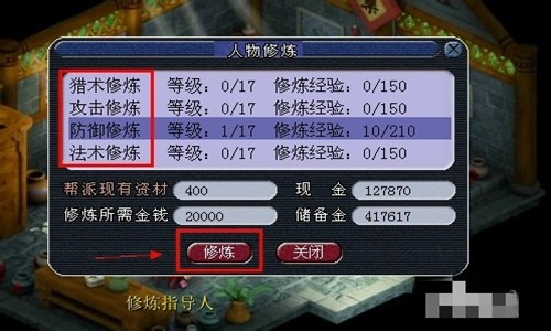 5、选择自己要修炼的内容,并且点击下方的“修炼”就可以了,所需的金钱和修炼经验都在屏幕上有显示的。