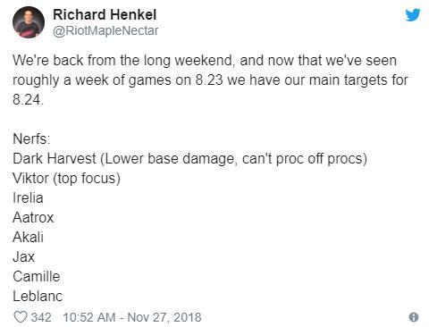 由于8.24测试服周期在本周四就会锁定改动方案,并且于下周三上线外服,平衡团队的产品负责人Maple Nectar,今天中午也是公布了他们在8.24版本中将会削弱的英雄和符文。以下是8.24版本的优先削弱名单,像普朗克这种英雄的改动,可能放到了后续的8.24b版本了。