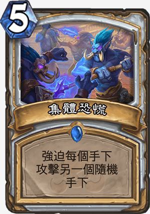 集体恐慌,牧师蓝卡,5 费,法术,使每个随从随机攻击其他随从。一张解场卡。机制尚不清楚的一张卡,是每个随从都攻击其他随从一次,还是自己的的随从随机攻击其他随从一次,只有等发售了才知道。