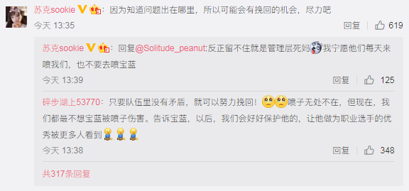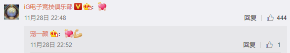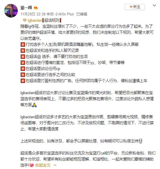 有趣的是,就在昨天iG的官博点赞并评论了关于宝蓝的一则“超话规则”: