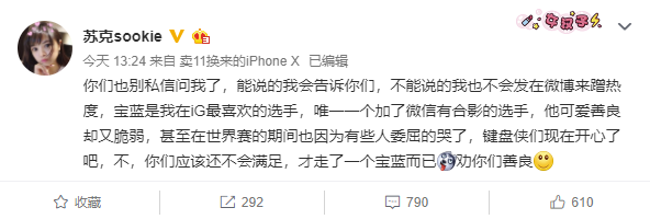 你们也别私信问我了,能说的我会告诉你们,不能说的我也不会发在微博来蹭热度,宝蓝是我在iG最喜欢的选手,唯一一个加了微信有合影的选手,他可爱善良却又脆弱,甚至在世界赛的期间也因为有些人委屈的哭了,键盘侠们现在开心了吧,不,你们应该还不会满足,才走了一个宝蓝而已,劝你们善良。