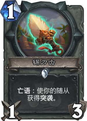 锯刃齿。盗贼白卡武器:1费1/3。亡语:使你的随从获得突袭。盗贼在亡语的道路上越走越远,每个版本至少给一张亡语武器,继小斧子后,圣光的正义也被完爆,为了节奏,贼连刀都不需要转了。