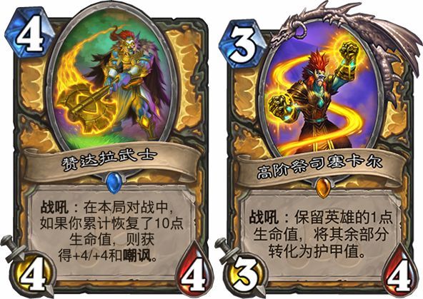我们来看赞达拉圣坛武士,这回合治疗血量高的话它就会越强,这对玩家来说就可以考虑使用一些会对自己造成伤害的卡牌,像是高阶祭司等就可以跟这张卡牌搭配,或迅猛龙之神也有类似的堆叠效果。