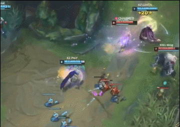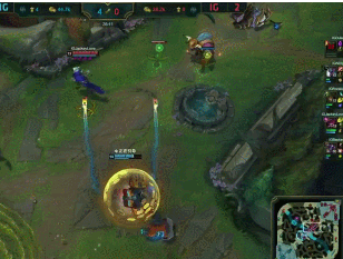 先手被洛R闪R开到的一瞬间我想所有人的想法都和我一样——没了,更何况旁边还有一个虎视眈眈的男枪。但UZI没有慌,先细节A了洛一下挂上被动的他开始往后拉扯,并有R技能的一小段唯一躲开了最致命的男枪大招。随后在男枪Q和霞R放出的一瞬间使用闪现躲开了所有技能,躲开了必死的一次三人围剿。