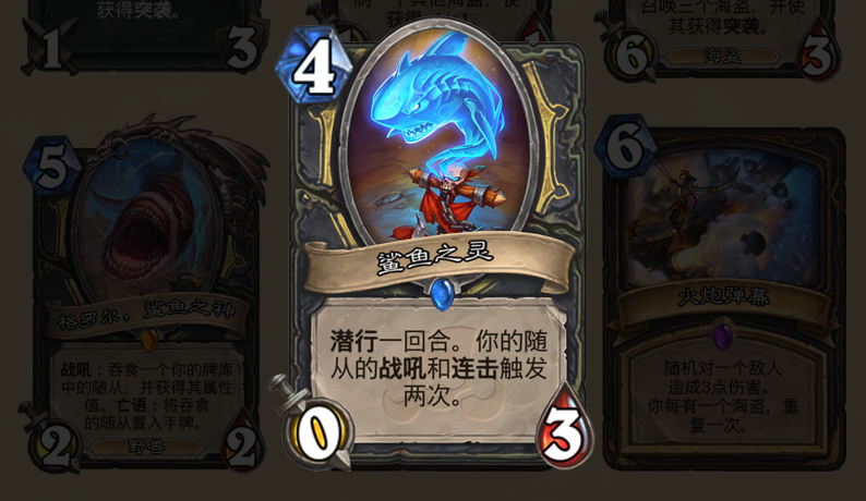 战吼和连击触发两次,简直就是盗贼的最爱。在这个版本中,无论是搭配精灵用场合过牌还是搭配刺骨打爆发,都是一个非常不错的选择。试想一下,当鲨鱼之灵召唤出之后,搭配伺机待发加刺骨,间接等于在10费时两刺骨可以打出翻倍的伤害,想想都觉得这种玩法很刺激。