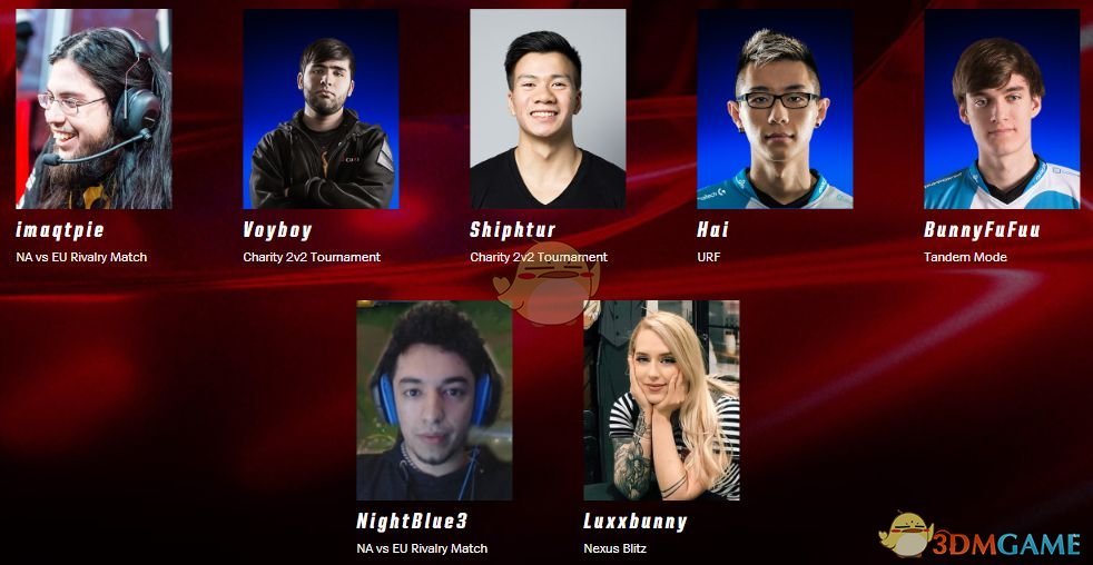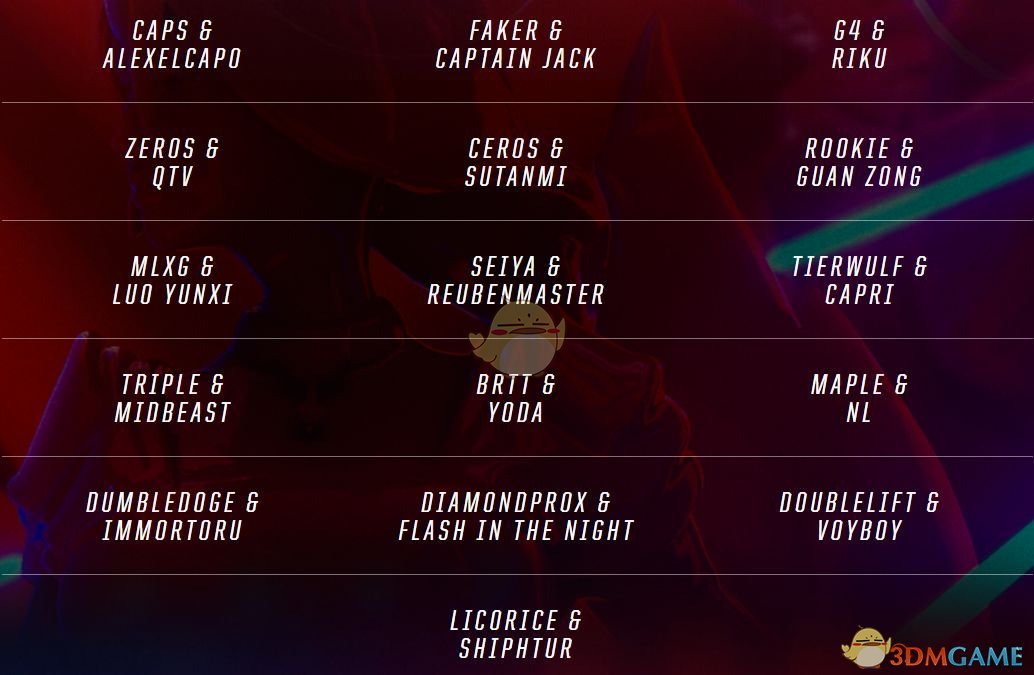 根据拳头官方给出的消息,在这个比赛中16名职业选手将搭配16名嘉宾组成16支队伍进行比赛,拳头给出的搭配列表如下: