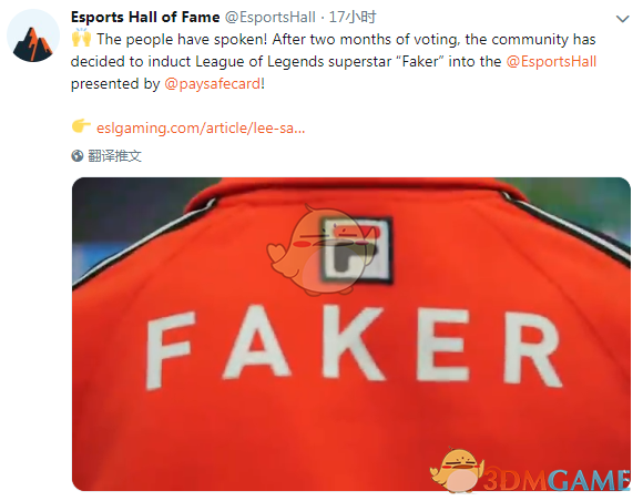 “是大家的呼声!在两个月的投票之后,英雄联盟的超级巨星Faker将加入电竞名人堂!”