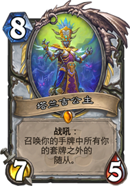 单说配合这张新卡灵媒术和老乌龟,就可以脏到一定程度了。大家可以想象一下对抗快攻,3、4费下老乌龟找一张优质嘲讽随从,5、6费随便上点随从打个鞭笞回点血自保一下,7费尖啸把场清干净,8费直接下公主把你手上的优质嘲讽随从全部拉出场,对面基本都会被你劝退了的。对抗慢速卡组,除了乱斗和尖啸,谁能一次解干净场面呢,还记得之前被大哥牧支配的恐惧吗?我感觉因为这张卡很可能亡语猎和大哥德要被打没了。