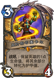 塞卡尔,这是喜欢奶骑的玩家必合的一张卡,可惜的是红石头人退环境了,否则2费硬币下个高阶祭司,再接2个88的红石头人直接就可以劝退对面了。