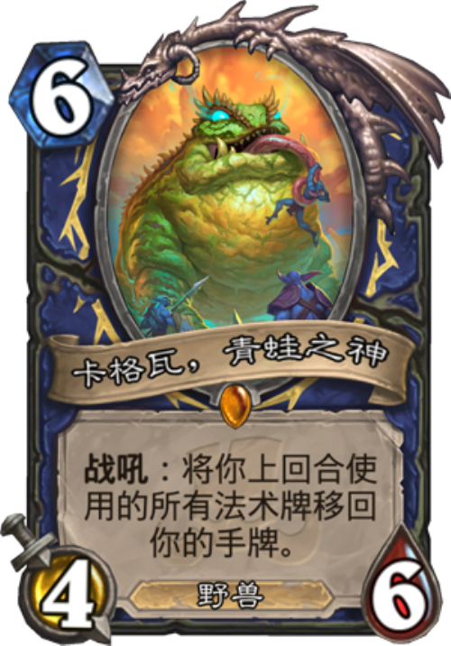 现在暴雪的惯例好像是每个版本出一张英雄卡,上个版本是萨满,这个版本就轮到猎人了,虽然变身之后的技能不怎么强(造成2点伤害),但变身时候的战吼是非常厉害的,毕竟这个法术可以自己控制,而猎人的很多法术都是只有正收益的,无论在法术猎还是奥秘猎卡组中,这张卡应该都是有位置的。