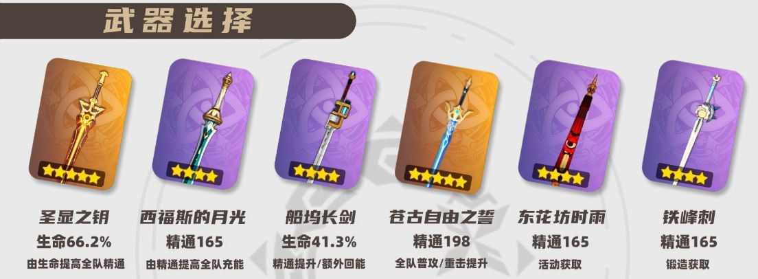 治疗挂雷辅助可优先考虑生命类武器提高战技的治疗量;超绽放玩法可优先考虑精通武器提高久岐忍触发的超绽放伤害。