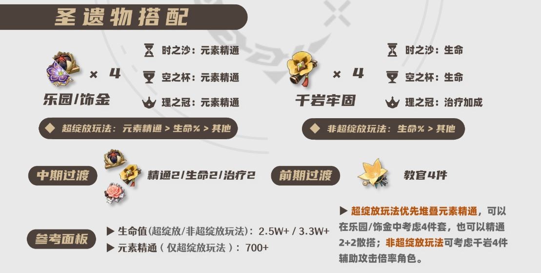 治疗挂雷辅助可优选【千岩牢固】4件提高队内攻击倍率角色的攻击力;超绽放玩法可考虑“饰金”、“乐园”的4件套或者“精通2+2”的散搭。