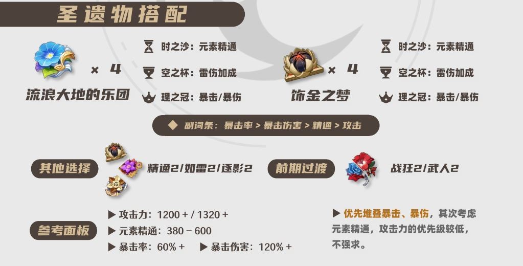 无论哪种玩法,套装都优先考虑【流浪大地的乐团】4件,其次可选择【饰金之梦】4件。