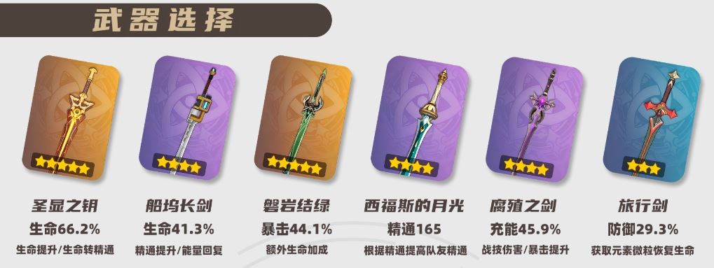 武器只推荐「圣显之钥」、「船坞长剑」,如有高精练磐岩结绿也可选择(仅精1推荐优先给其他单手剑输出角色),其他武器差别不大。