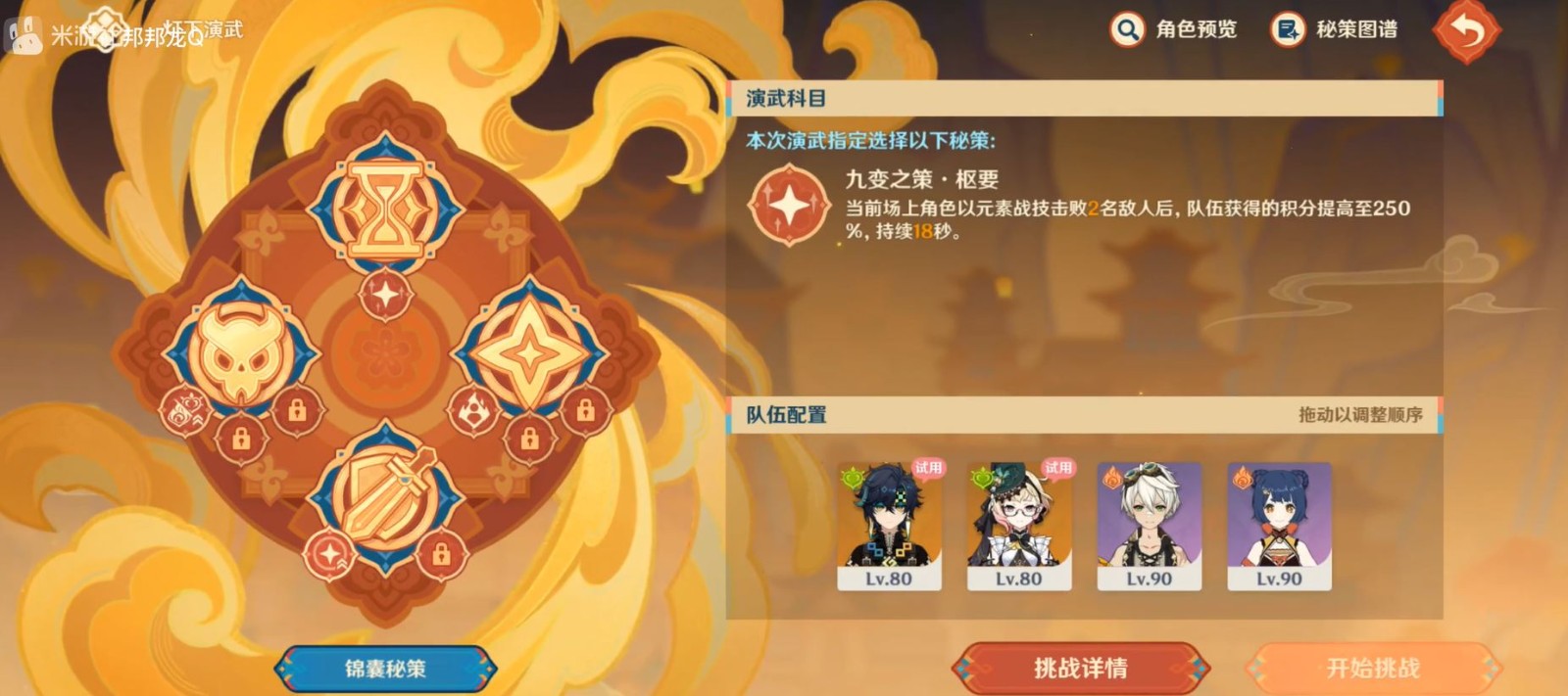 这次试用让我们体验基尼奇的燃烧队,所以说我们带上基尼奇和调香师,同时用我们的班尼特和香菱,然后组成一个基础燃烧队,香菱大家深渊估计都能领一个,然后班尼特的话,如果大家没有就带安柏或者其他的火系角色,只要有挂火能力即可。