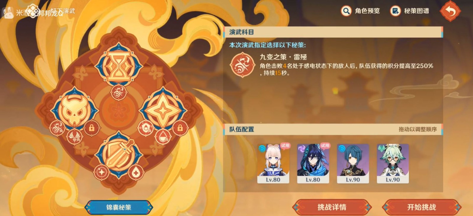 心海其实当前版本主要是当奶妈的,但是这里试用的话,我们就凑一个感电队伤害也非常高,同时试用套装是海染套也会补一定的伤害。剩下的队友推荐从风系,特别是后台风,像温迪砂糖这种选择,或者是我们的新角色,然后剩下那个位置水系和雷系后台任选其一都可以。