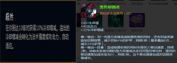 通过卡莎的Q技能艾卡西亚暴雨触发黑切的被动效果,最多减少敌方英雄的24%的护甲,当卡莎到达十级的时候,符文超然提供10%减CD+黑切20%减CD+CD鞋10%的减CD之后,第二个大件死亡之舞提供的10%减CD将会因为超然转换成12攻击力,这样的装备不仅提高了卡莎在中期的输出,也提高了卡莎在团战中的容错率。
