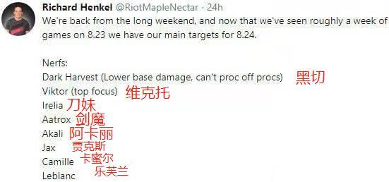 除了刀妹和黑切,在8.24中针对上单维克托,也会在保证中单维克托不会消失的前提下,对Q技能进行削弱,另外同样在世界赛上有着出色发挥的剑魔、阿卡丽、贾克斯、卡蜜尔、妖姬也在将要削弱的名单当中,崔叔也会对具体数据持续关注。
