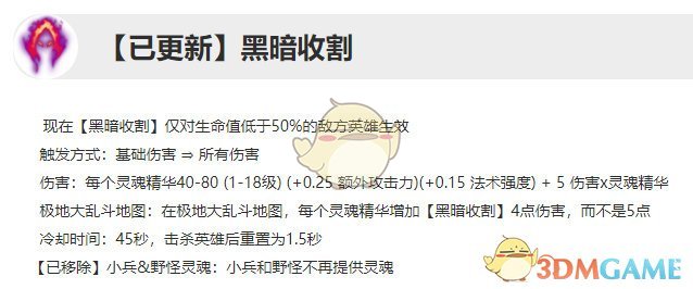 后期AD加成高达1.6,CD仅为4S,这无疑是一个出色Poke技能,一旦触发黑暗收割那爆发伤害就是惊人的。