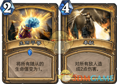 下面解析几个可用于解场的aoe,首先是生而平等加奉献,对快攻卡组而言2血的怪会被奉献顺利解干净,生而平等也能将生命值高的怪配合奉献清空对面的场面。